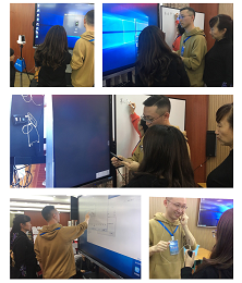 23日下午3:00开幕式召开之后,张超老师立即到展示室熟悉教学设备、调试教学仪器。对主办方提供的“希沃授课助手”,张超老师认真学习技术指导老师授课的内容,并积极向其他老师请教。