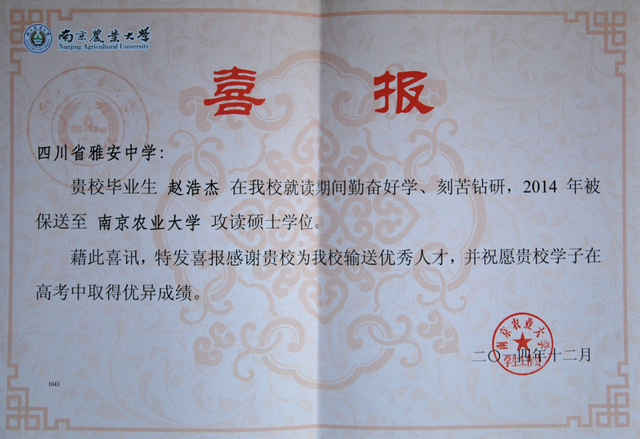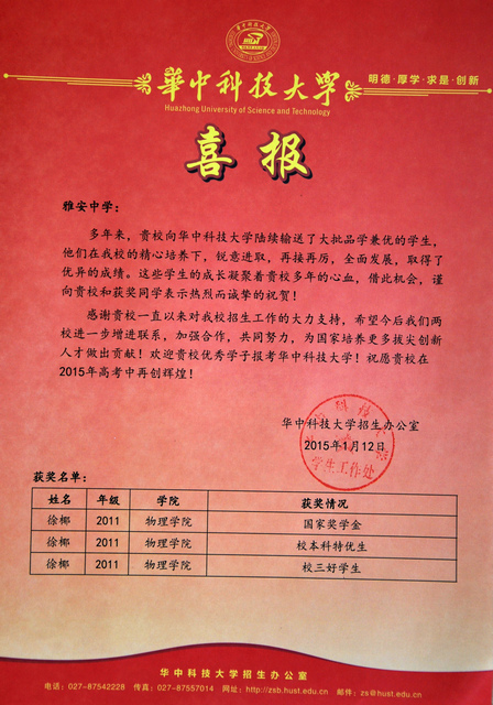 近日,华中科技大学和南京农业大学向我校发来喜报,对我校就读以上两所高校的毕业生取得的优异成绩进行通报,并对我校向以上两所高校输送优秀人才致以衷心感谢。