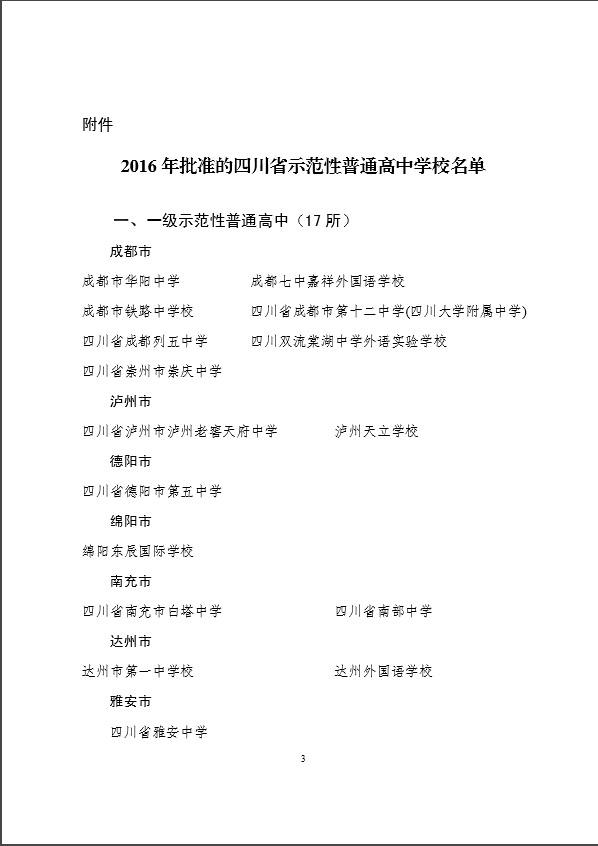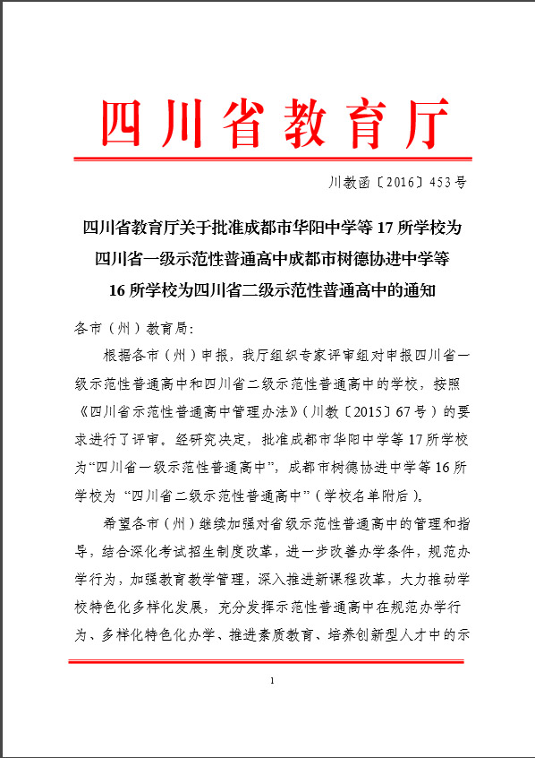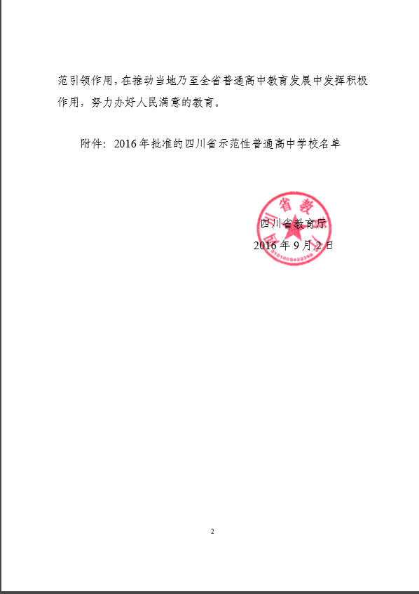 近日,根据四川省教育厅文件【川教函(2016)453号】通知精神,雅安中学被四川省教育厅批准为“四川省一级示范性普通高中(原国家级示范性普通高中)”,成为我市第一所被评为“四川省一级示范性普通高中”的高中学校。该荣誉的获得体现了省教育厅、社会各界对雅安中学长期以来在提升软硬件实力,加强教育教学管理,深入推进课程改革,推动学校特色化多样化发展取得的突出成绩的综合认可,对引领全市基础教育发展有着深远和重大的意义。